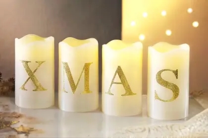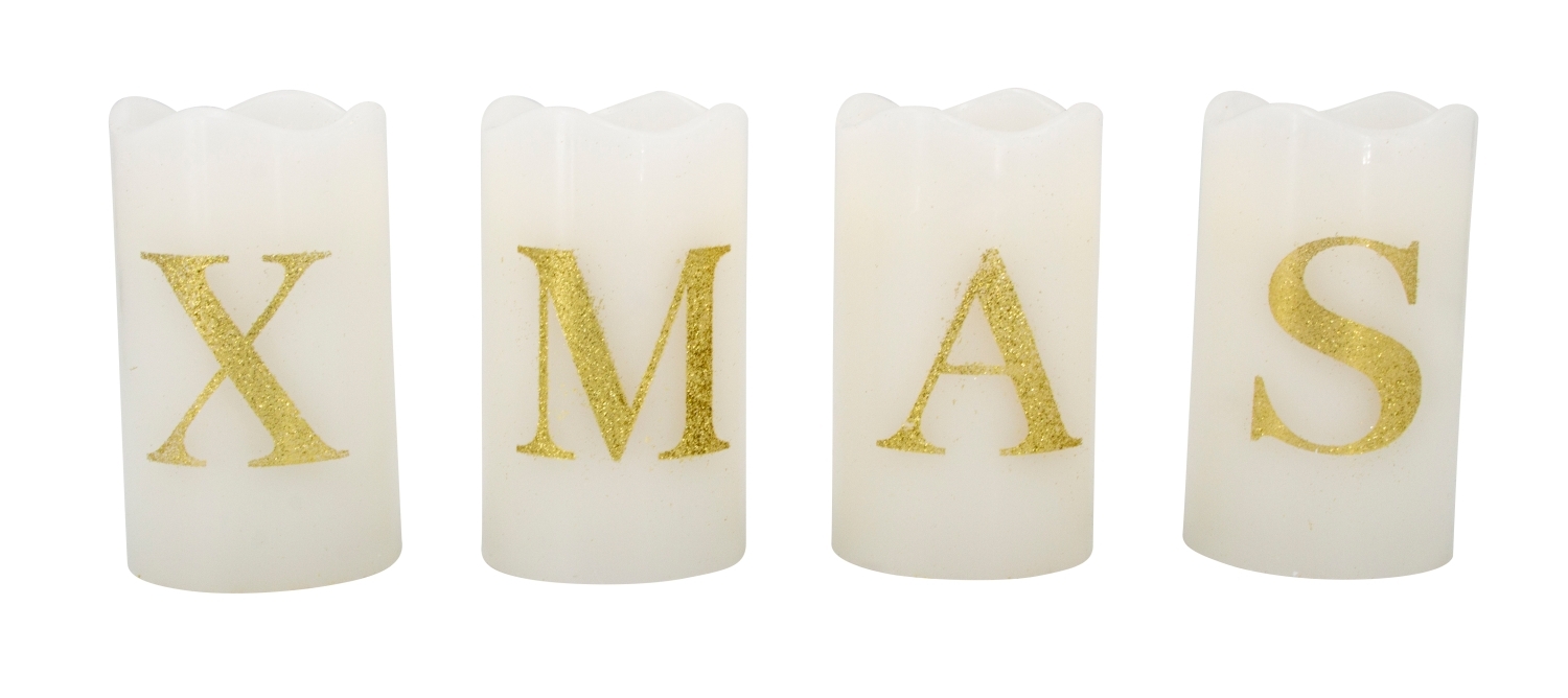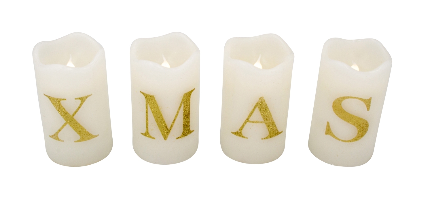 LED-Kerzen weiß mit "XMAS" h=12cm d=7cm, Set-preis für 4 Stück!