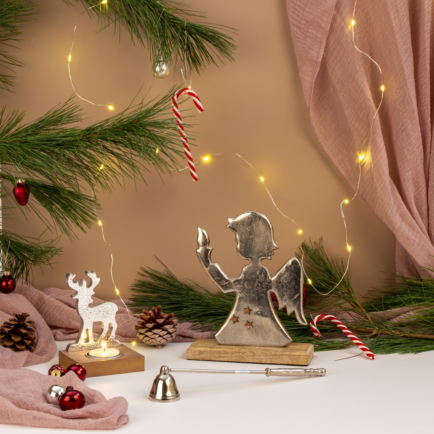 Angel + deer on wooden base f. T-light h=11,5+12cm w=8,5cm asst.